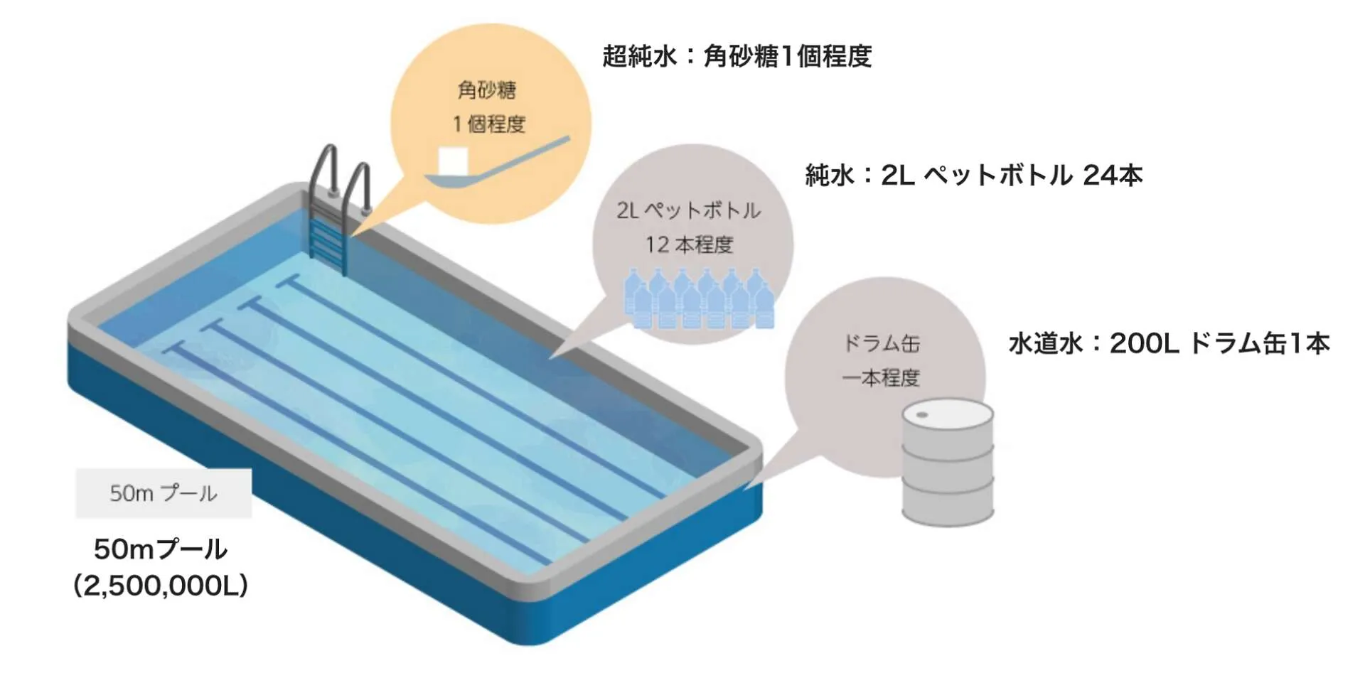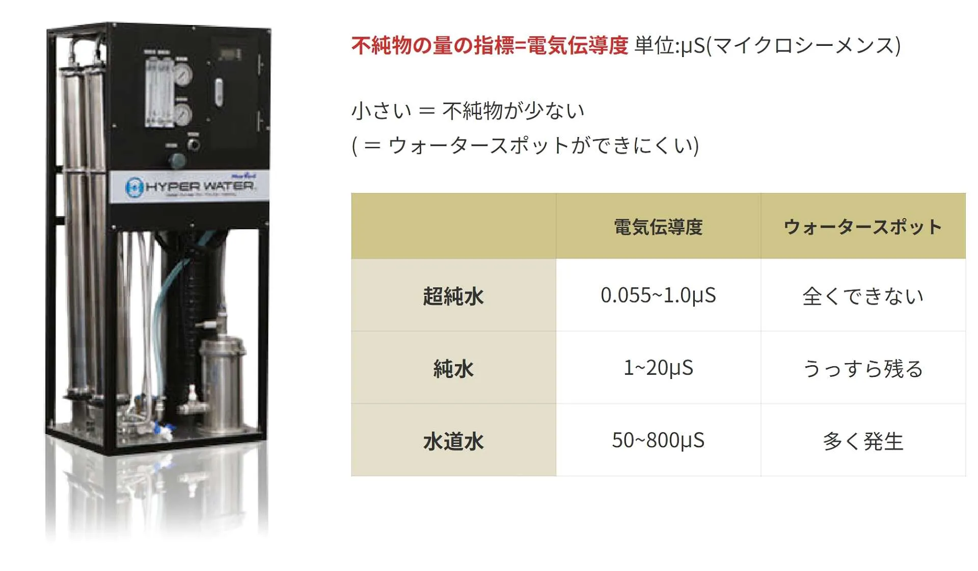 日本の水道水中に含まれる不純物は、電気伝導度で測定すると50~800μSとなります。ハイパーウォーターから出てきた水の電気伝導度を測定すると、0.06μSとなっており、超純水の域に達していることが確認できます。